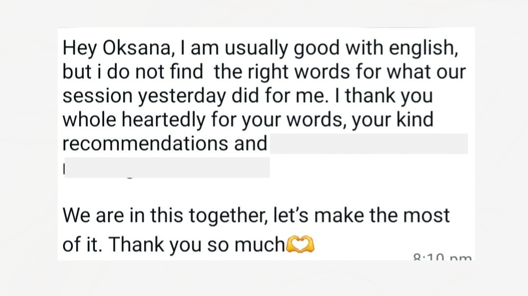 From the very first meeting, I felt seen in a way I never had before. I have worked with therapists in the past, and that support was helpful. But with Oksana, I did not feel the need to make my pain smaller or more acceptable. I could speak openly, without holding back.