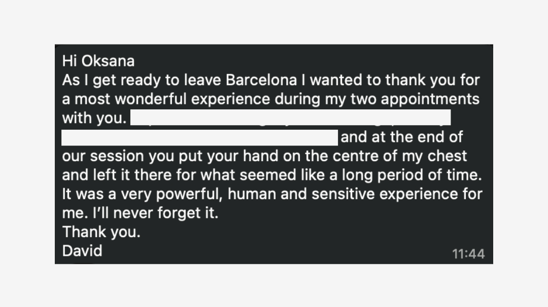 If you are reading this, you're already finding a gem. It was more than a session. It was a ritual, after which your body and heart were ready to move mountains. I am glad to meet Oksana and believe to see her again.